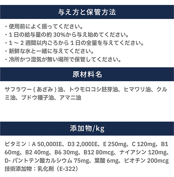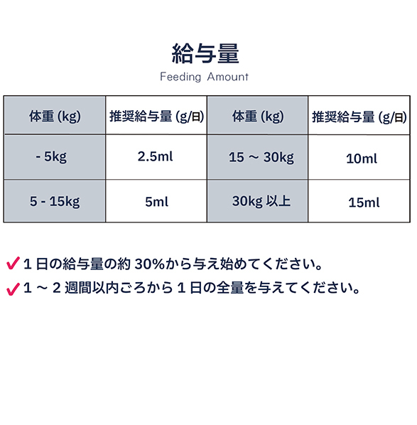 ・使用前によく振ってください ・1日の給与量の約30%から与え始めはじめてください。 ・1~2週間以内ごろから1日の全量を与えてください。