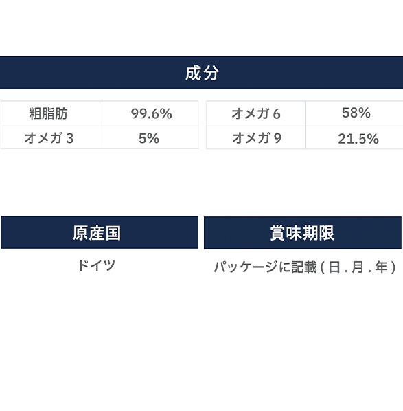 サフラワー(あざみ)油、トウモロコシ胚芽油、ヒマワリ油、クルミ油、ブドウ種子油、アマニ油