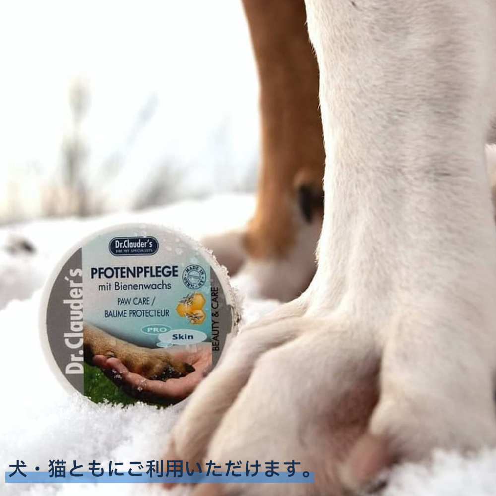 ビーズワックス配合。肉球と肉球の間は は、季節を問わずケアと保護が必要です。Dr.Clauderの肉球ケアは、負担や路面によるひび割れや亀裂を防ぎます。特に 特に冬は、塩分、氷、雪から肉球を保護することが不可欠です。このレシピは、長期的なケアと保護を提供します。有効成分が素早く吸収され、蜜蝋が肉球を密封し、粗い表面や氷、雪から肉球を守ります。
